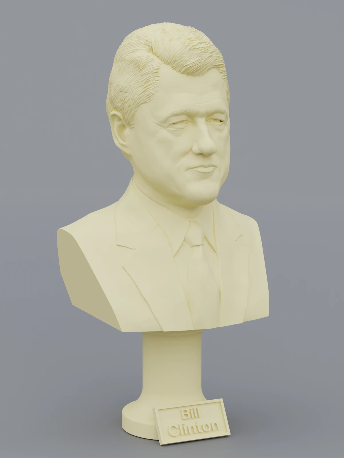 A traditional-style bust of Bill Clinton on a column pedestal. The bottom of the pedestal has a name plate.