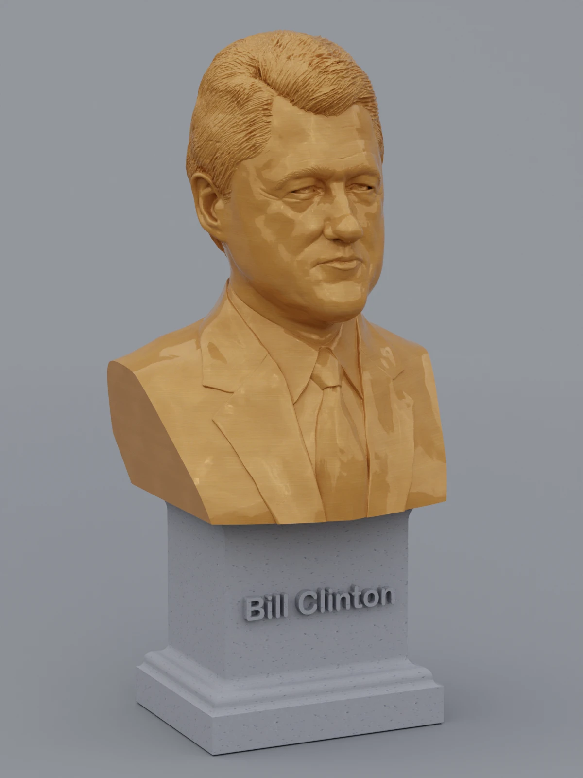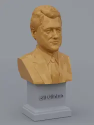 A traditional-style bust of Bill Clinton on a plinth pedestal. The plinth's front has a large name plate.