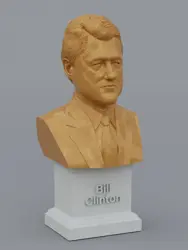 A traditional-style bust of Bill Clinton on a plinth pedestal. The plinth's front has a large name plate.