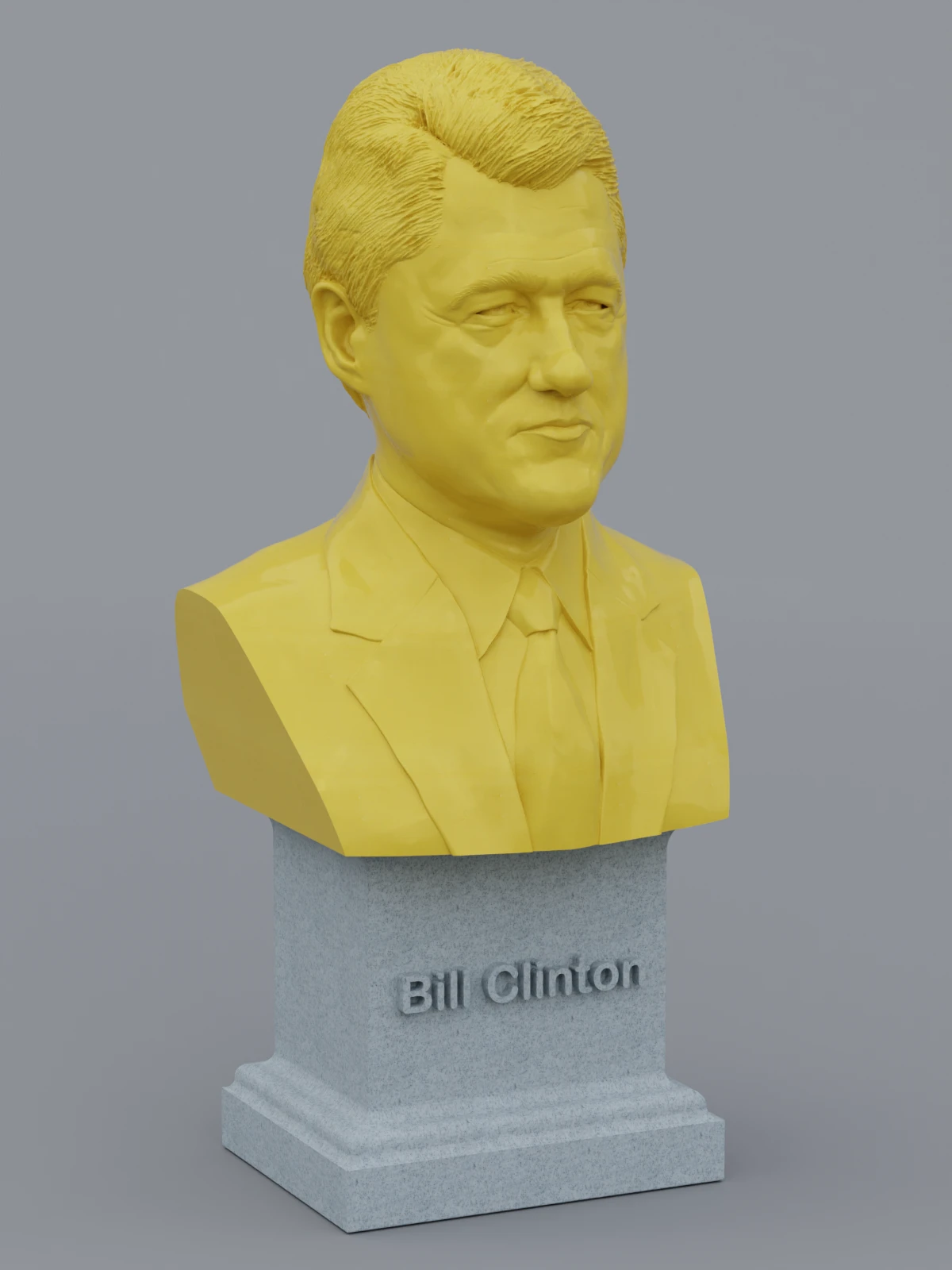 A traditional-style bust of Bill Clinton on a plinth pedestal. The plinth's front has a large name plate.