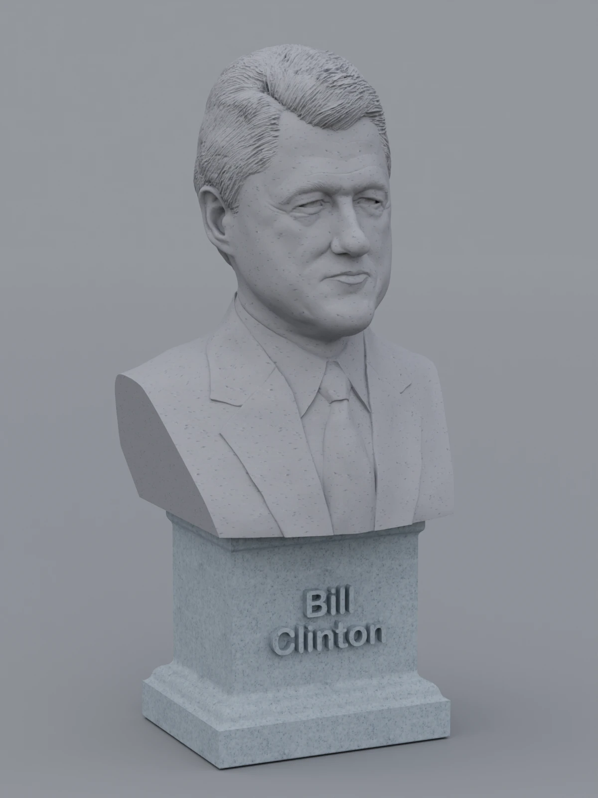 A traditional-style bust of Bill Clinton on a plinth pedestal. The plinth's front has a large name plate.