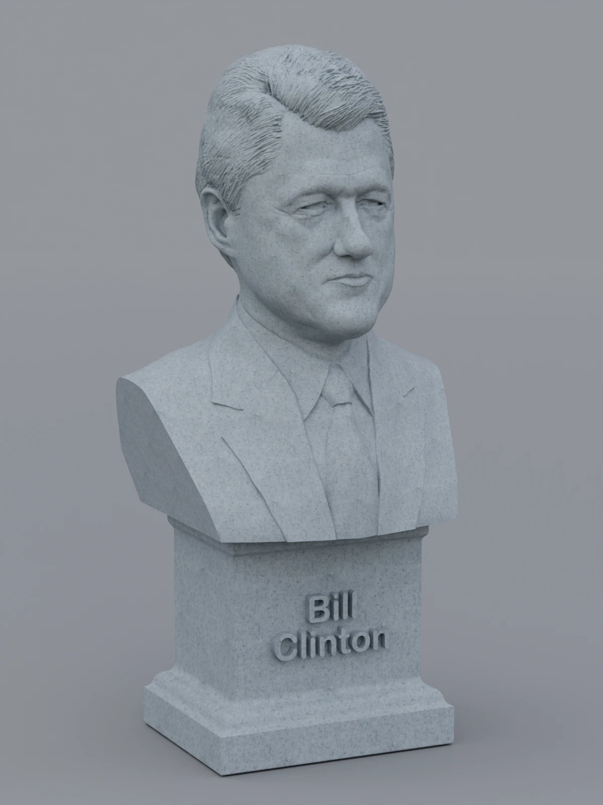 A traditional-style bust of Bill Clinton on a plinth pedestal. The plinth's front has a large name plate.