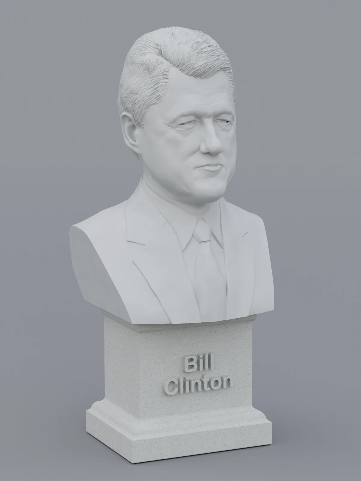 A traditional-style bust of Bill Clinton on a plinth pedestal. The plinth's front has a large name plate.
