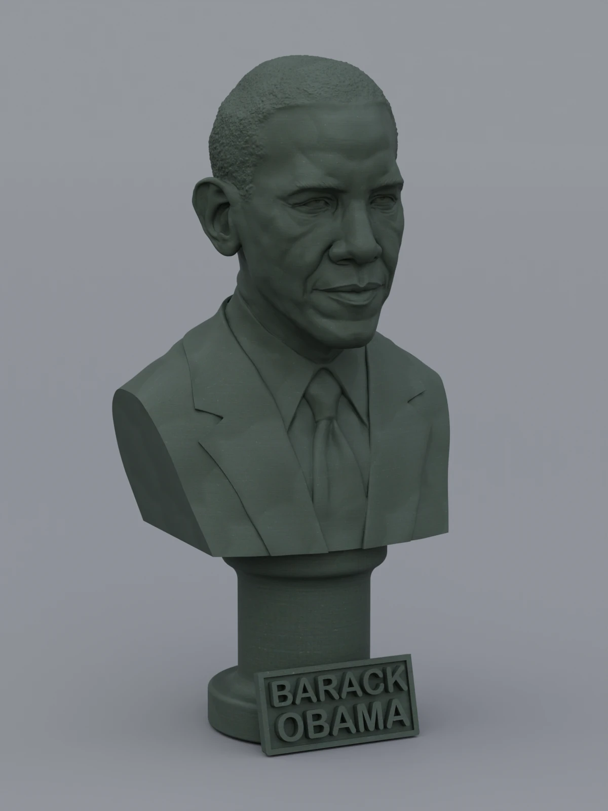 A traditional-style bust of Barack Obama on a column pedestal. The bottom of the pedestal has a name plate.