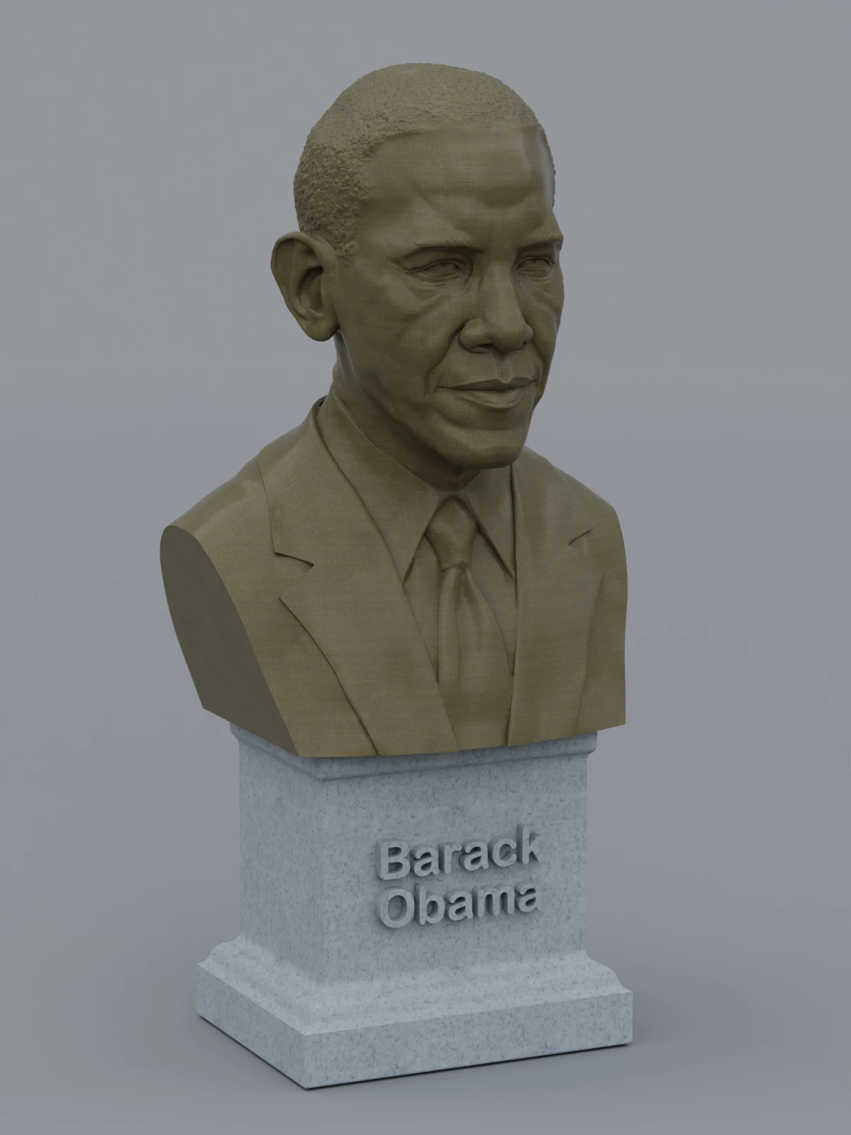 A traditional-style bust of Barack Obama on a plinth pedestal. The plinth's front has a large name plate.