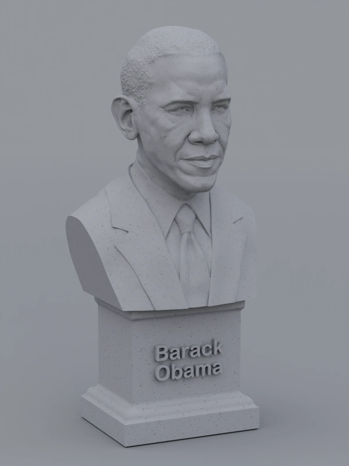 A traditional-style bust of Barack Obama on a plinth pedestal. The plinth's front has a large name plate.