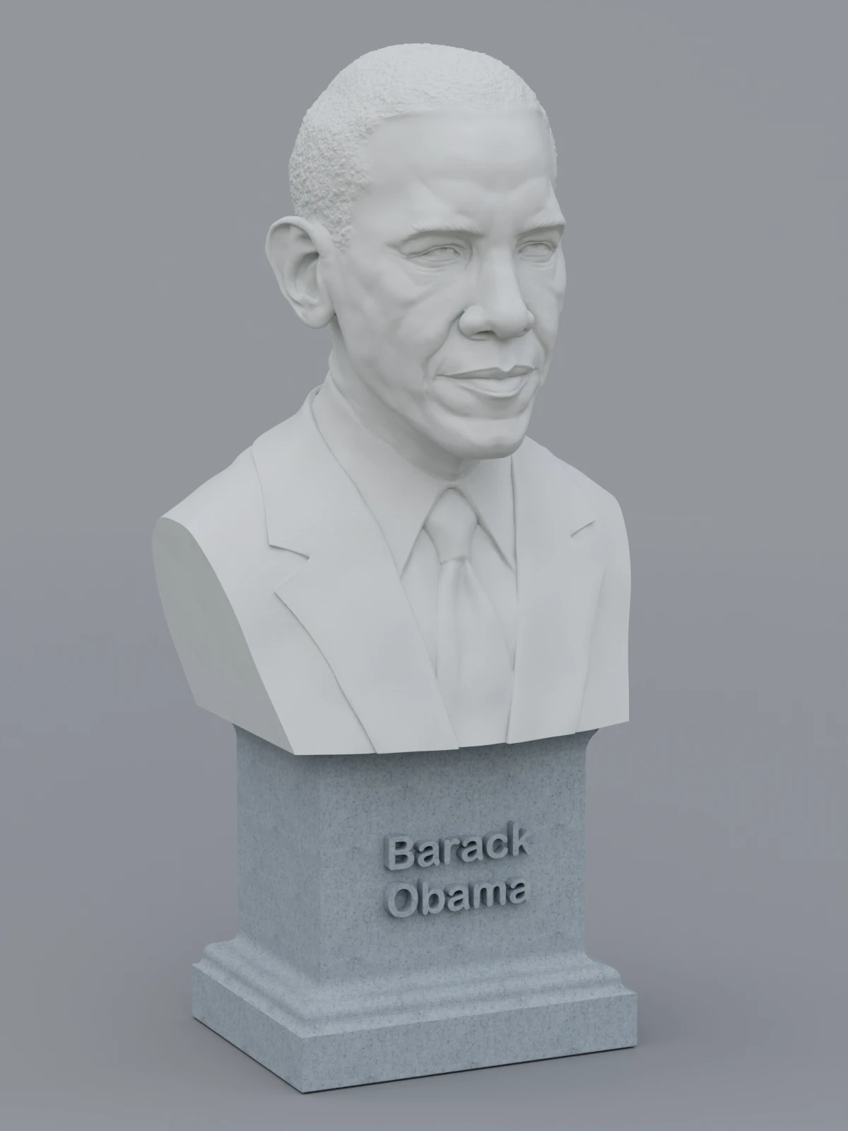 A traditional-style bust of Barack Obama on a plinth pedestal. The plinth's front has a large name plate.