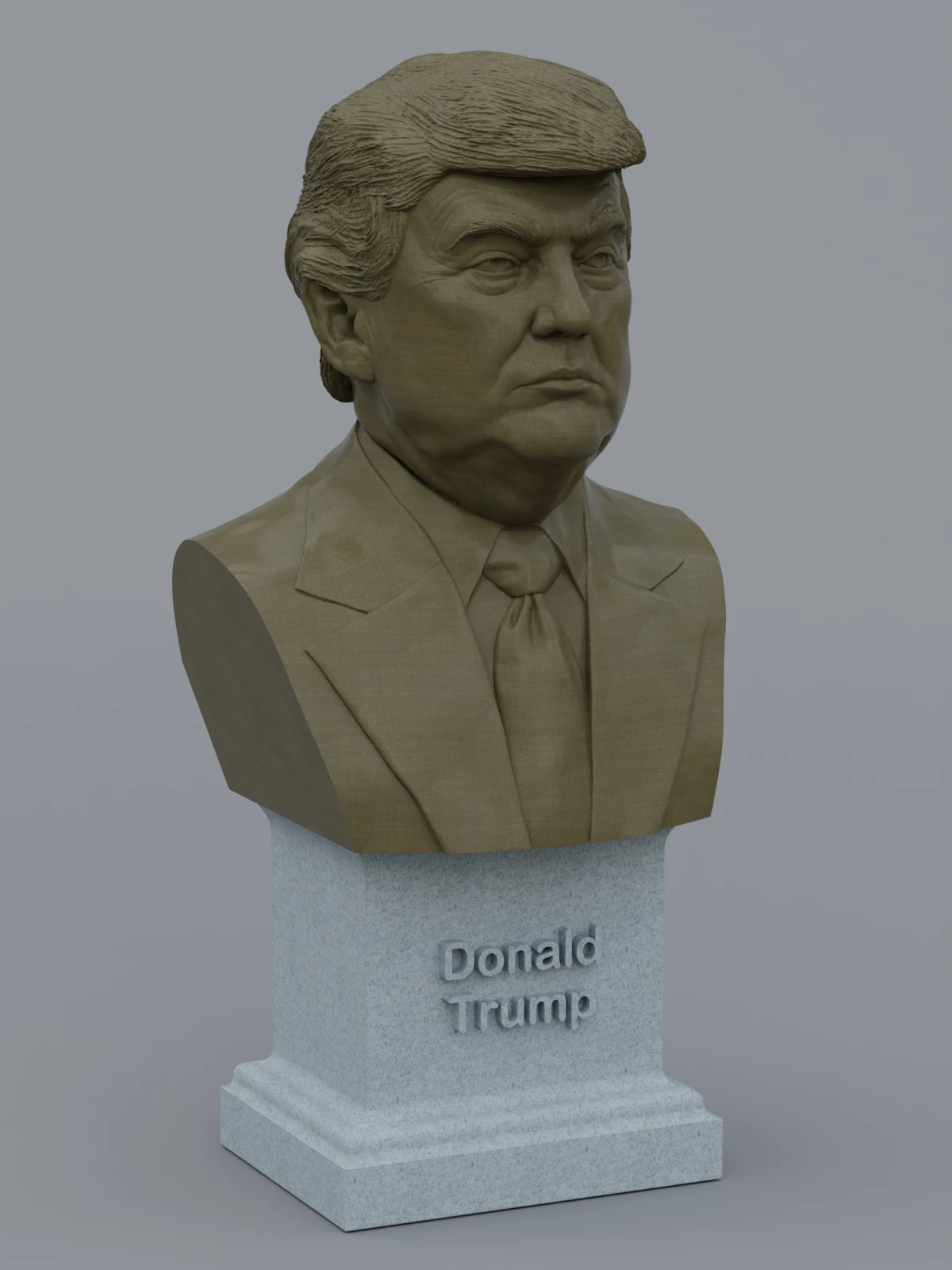 A traditional-style bust of Donald Trump on a plinth pedestal. The plinth's front has a large name plate.