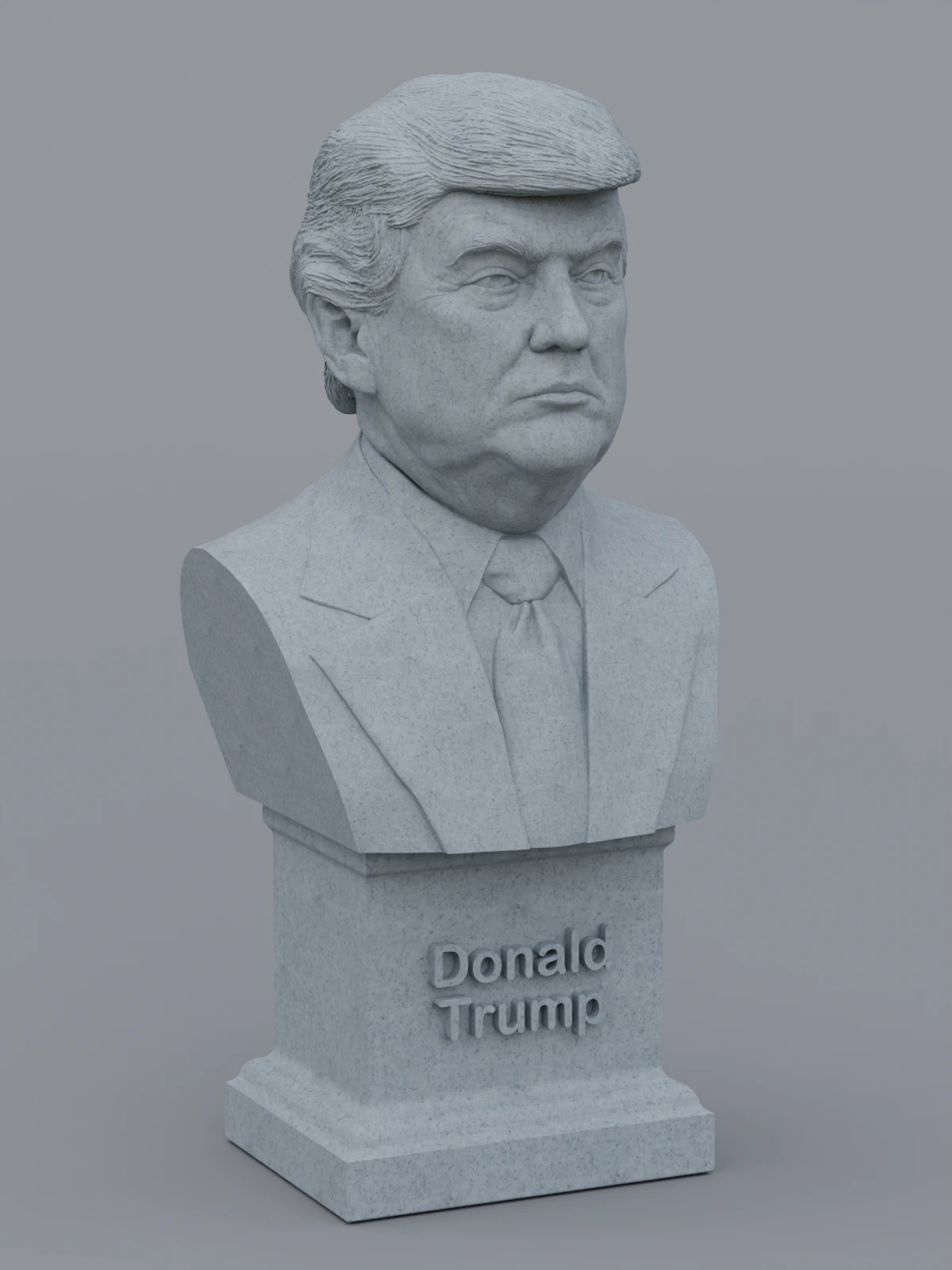 A traditional-style bust of Donald Trump on a plinth pedestal. The plinth's front has a large name plate.