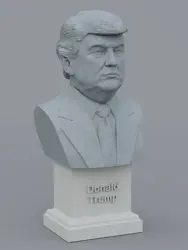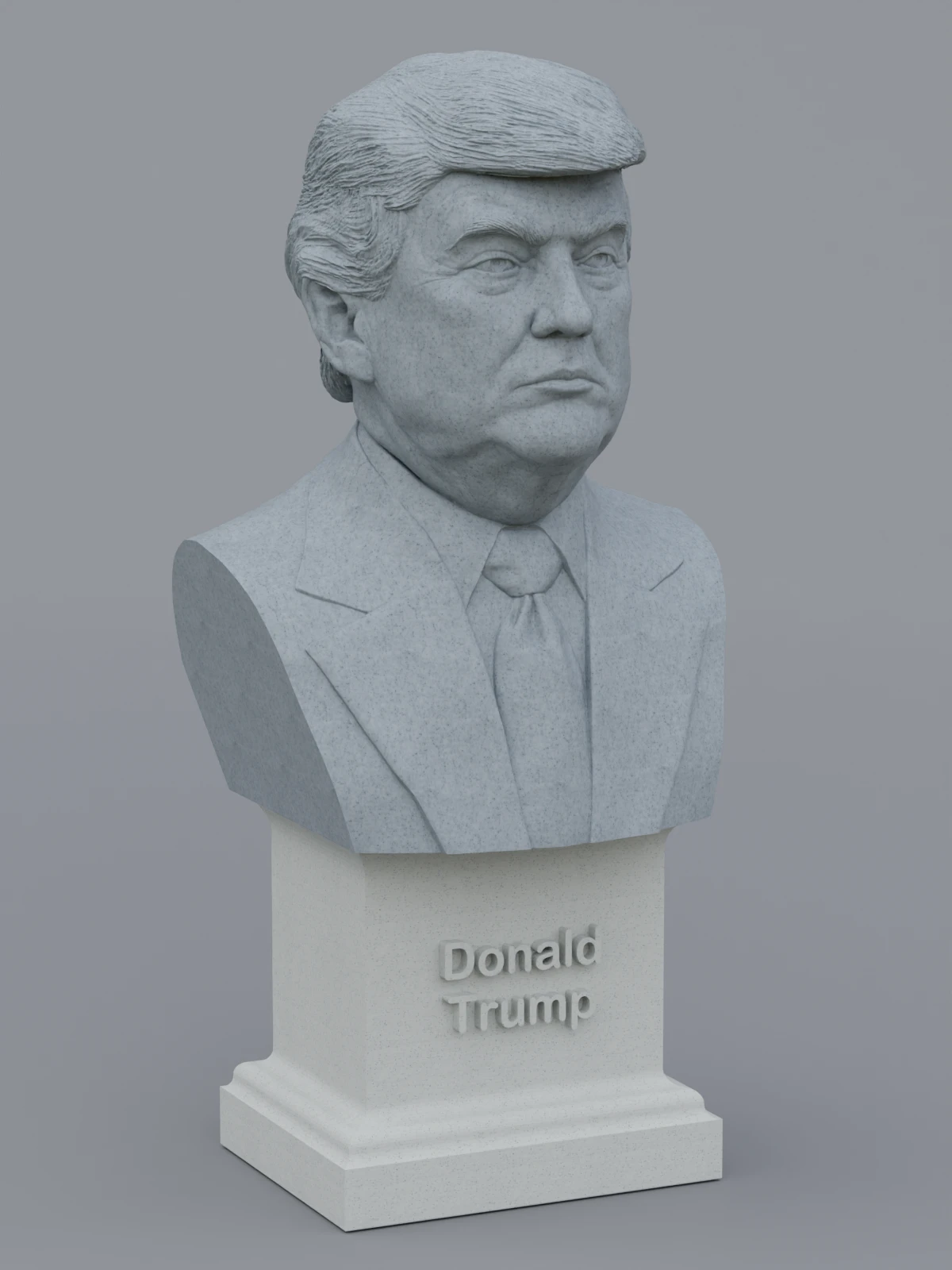A traditional-style bust of Donald Trump on a plinth pedestal. The plinth's front has a large name plate.