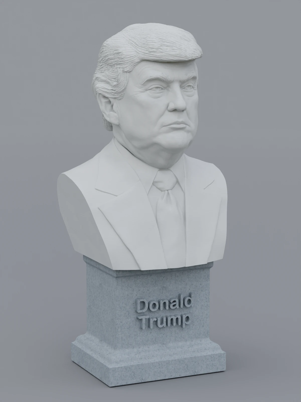 A traditional-style bust of Donald Trump on a plinth pedestal. The plinth's front has a large name plate.