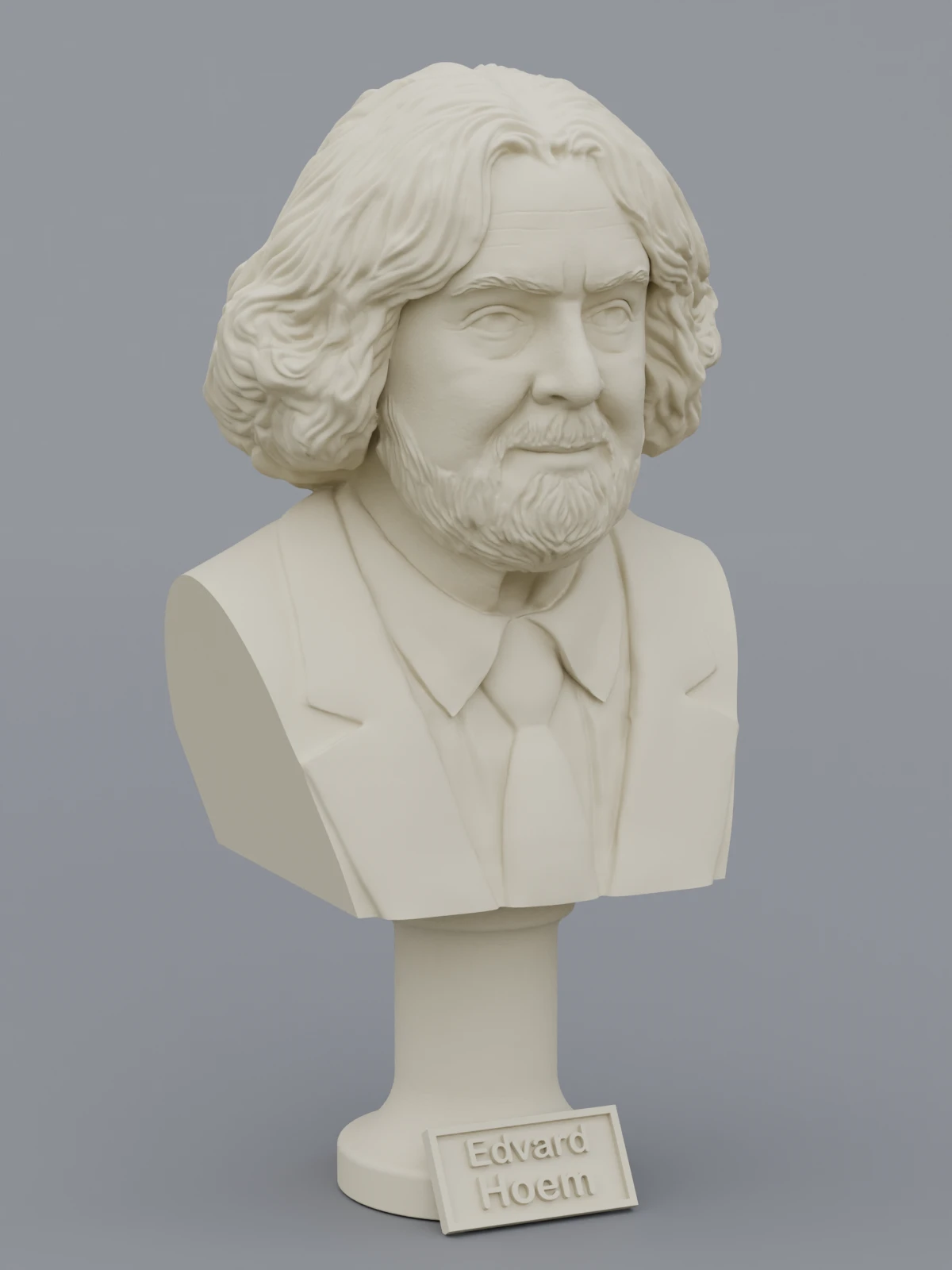 A traditional-style bust of Edvard Hoem on a column pedestal. The bottom of the pedestal has a name plate.