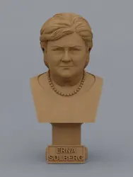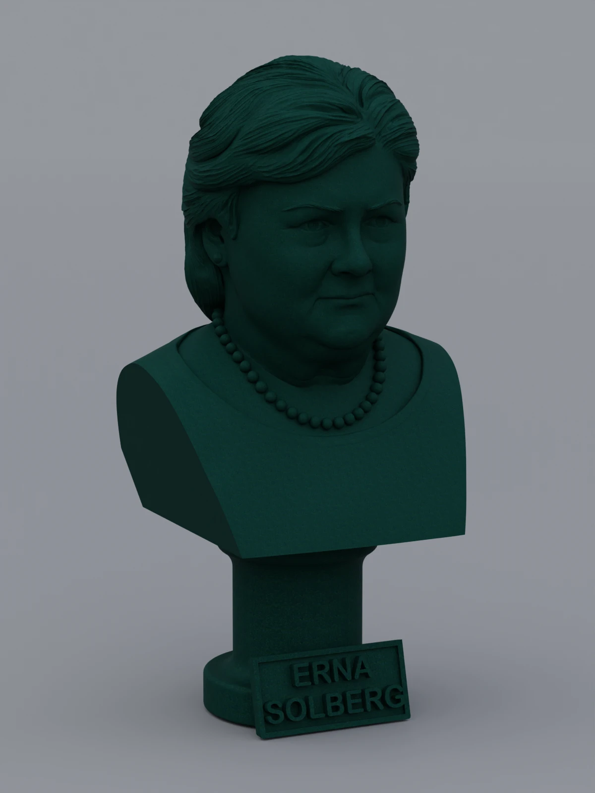 A traditional-style bust of Erna Solberg on a column pedestal. The bottom of the pedestal has a name plate.