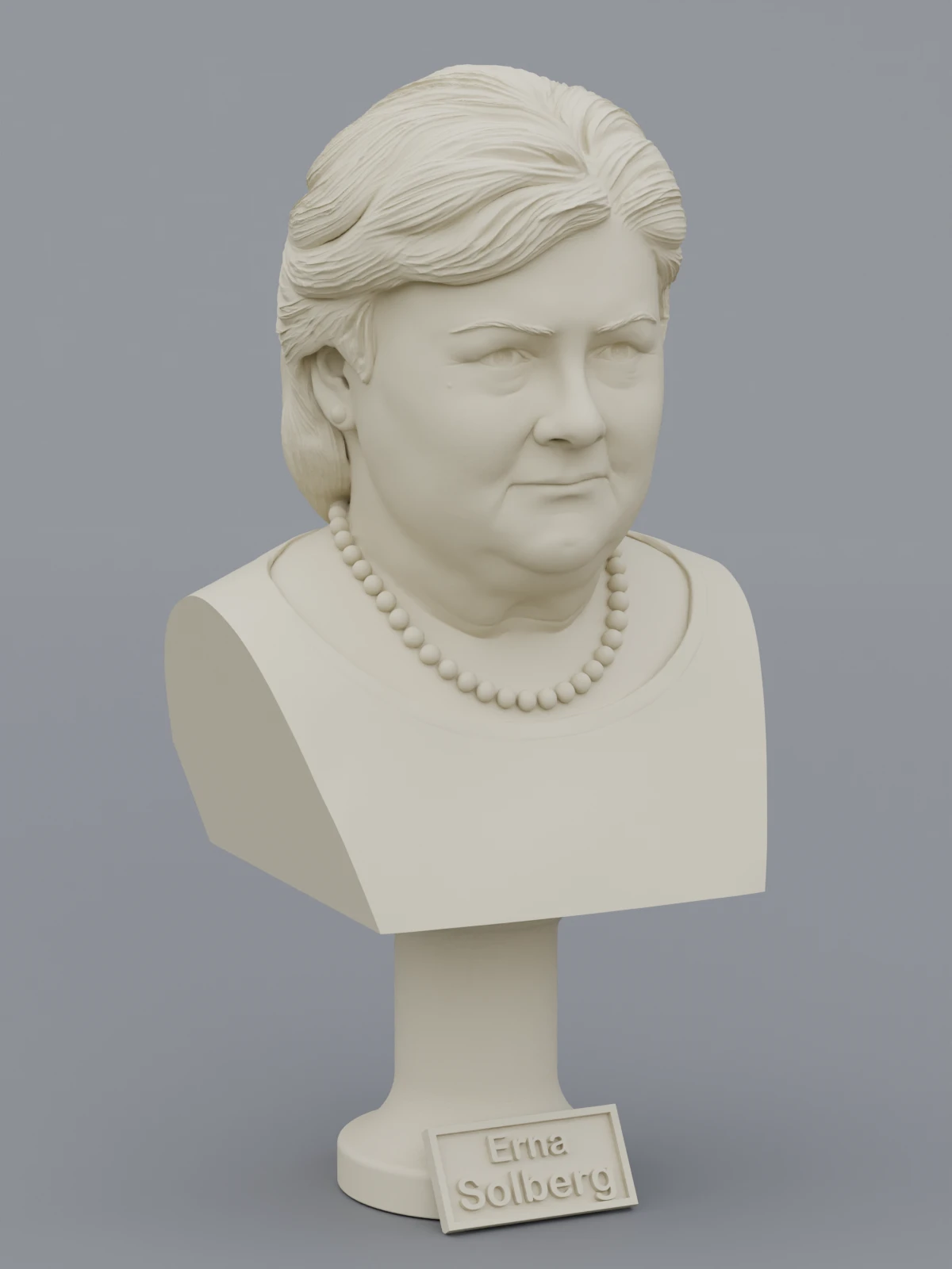 A traditional-style bust of Erna Solberg on a column pedestal. The bottom of the pedestal has a name plate.