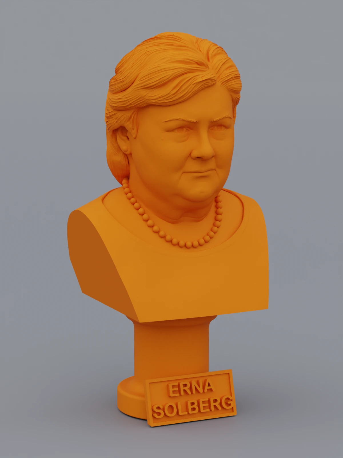 A traditional-style bust of Erna Solberg on a column pedestal. The bottom of the pedestal has a name plate.