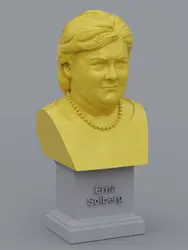 A traditional-style bust of Erna Solberg on a plinth pedestal. The plinth's front has a large name plate.