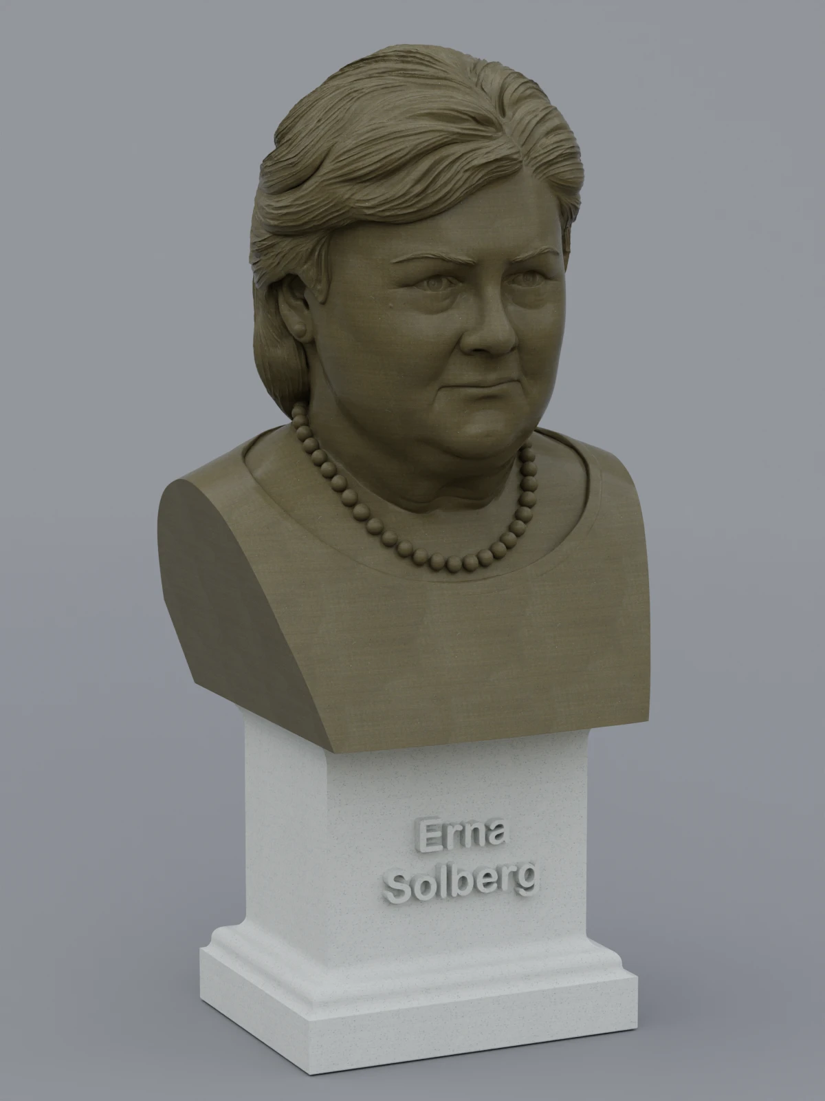 A traditional-style bust of Erna Solberg on a plinth pedestal. The plinth's front has a large name plate.