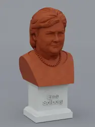 A traditional-style bust of Erna Solberg on a plinth pedestal. The plinth's front has a large name plate.