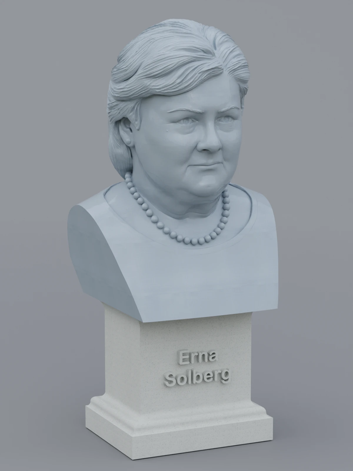 A traditional-style bust of Erna Solberg on a plinth pedestal. The plinth's front has a large name plate.