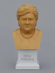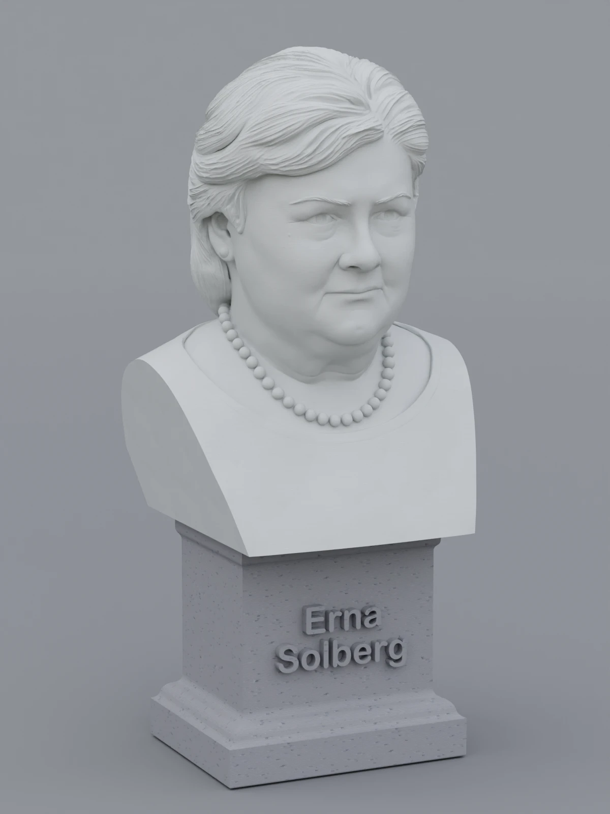 A traditional-style bust of Erna Solberg on a plinth pedestal. The plinth's front has a large name plate.