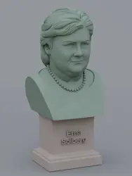 A traditional-style bust of Erna Solberg on a plinth pedestal. The plinth's front has a large name plate.