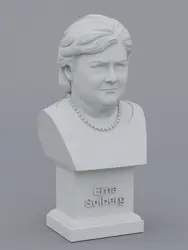 A traditional-style bust of Erna Solberg on a plinth pedestal. The plinth's front has a large name plate.