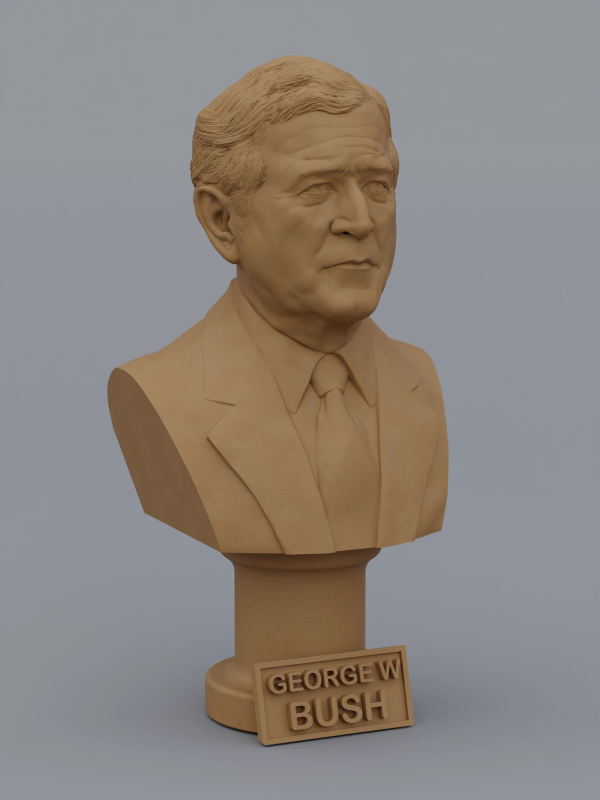 A traditional-style bust of George W Bush on a column pedestal. The bottom of the pedestal has a name plate.