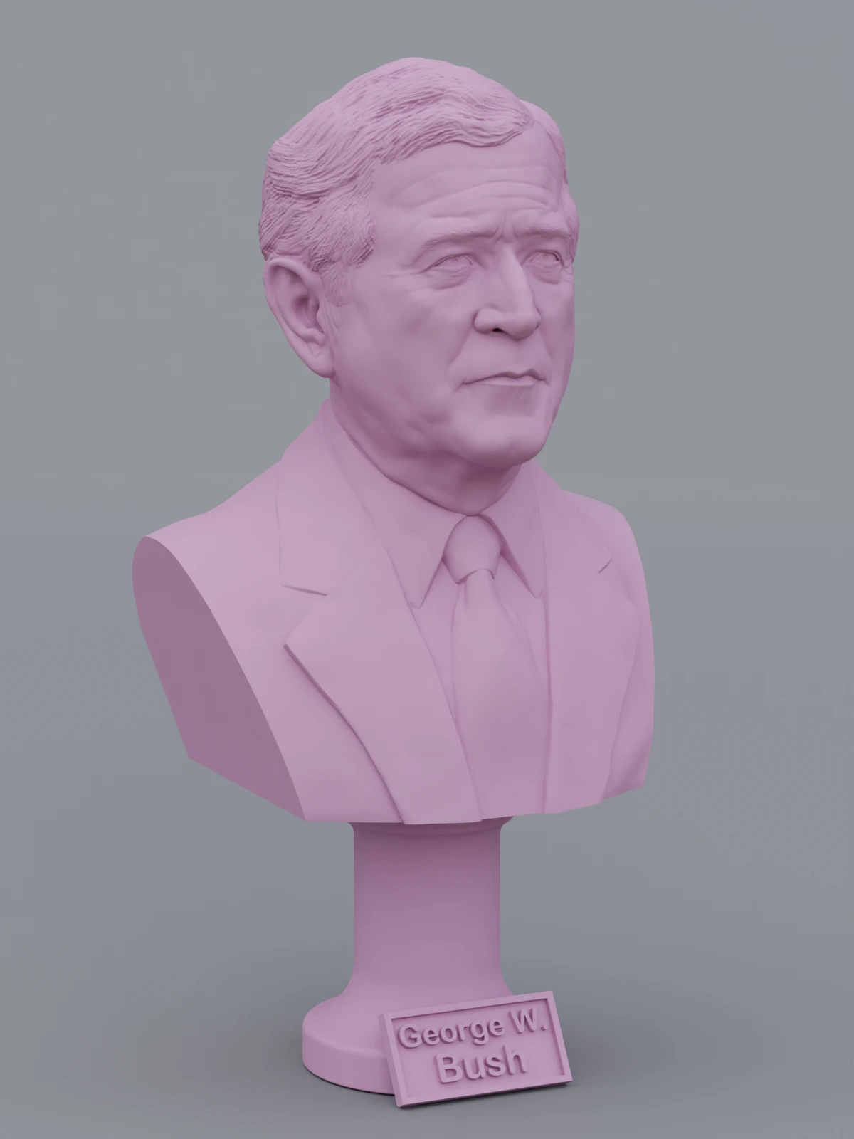 A traditional-style bust of George W Bush on a column pedestal. The bottom of the pedestal has a name plate.