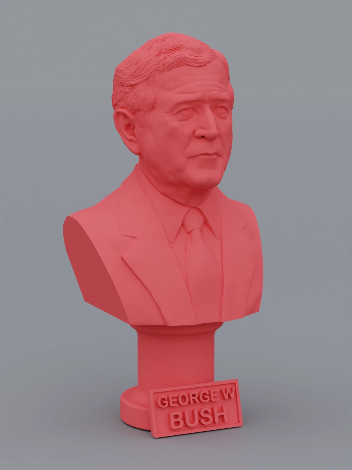 A traditional-style bust of George W Bush on a column pedestal. The bottom of the pedestal has a name plate.
