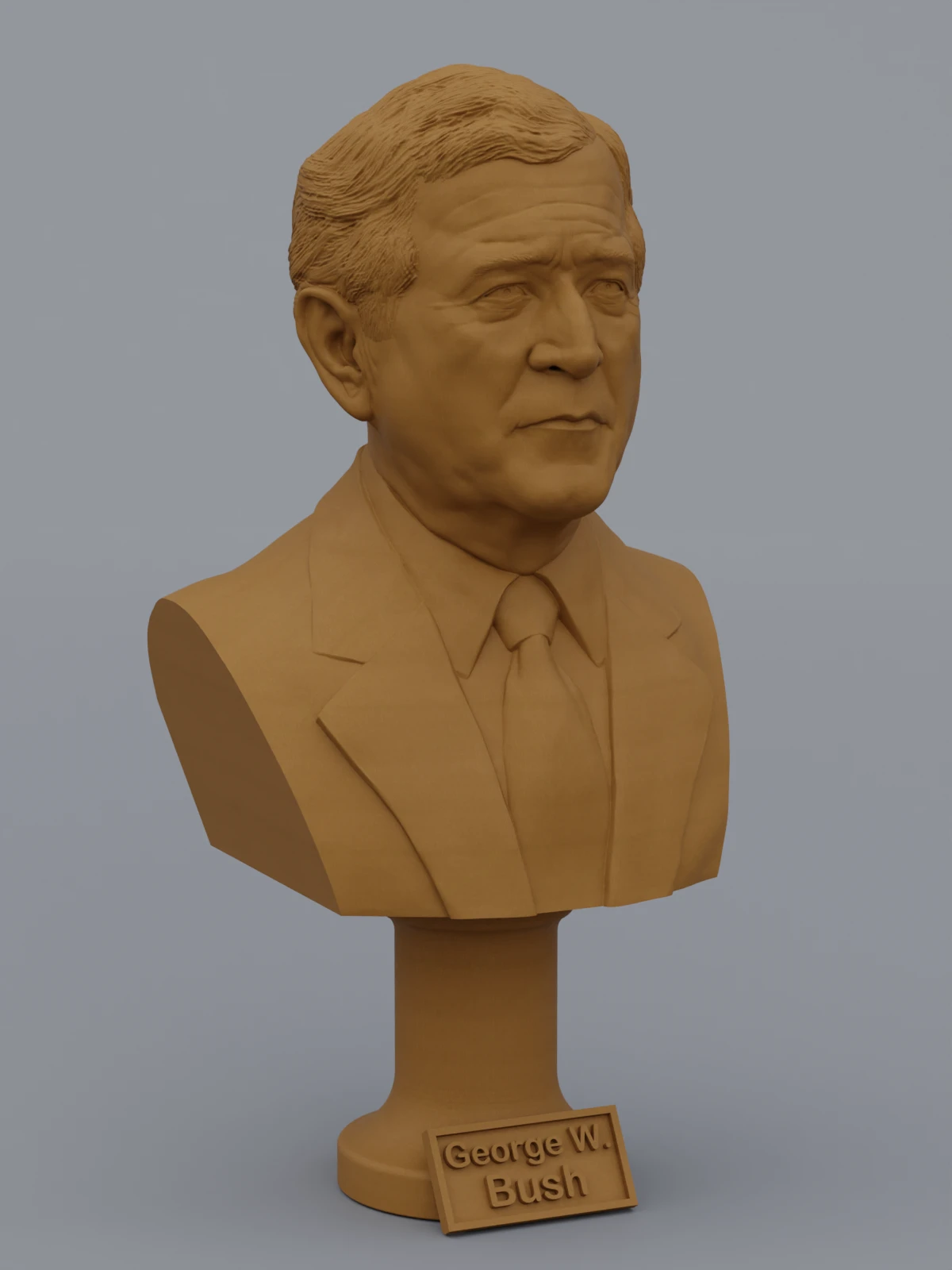 A traditional-style bust of George W Bush on a column pedestal. The bottom of the pedestal has a name plate.