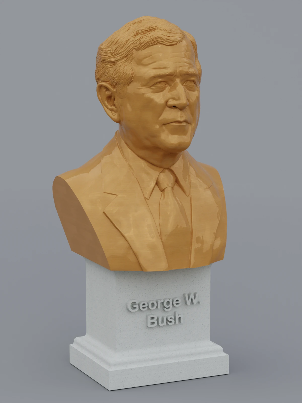 A traditional-style bust of George W Bush on a plinth pedestal. The plinth's front has a large name plate.