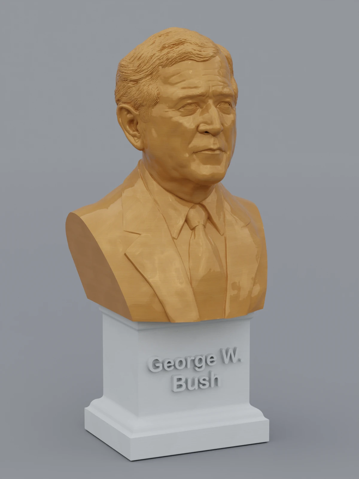 A traditional-style bust of George W Bush on a plinth pedestal. The plinth's front has a large name plate.