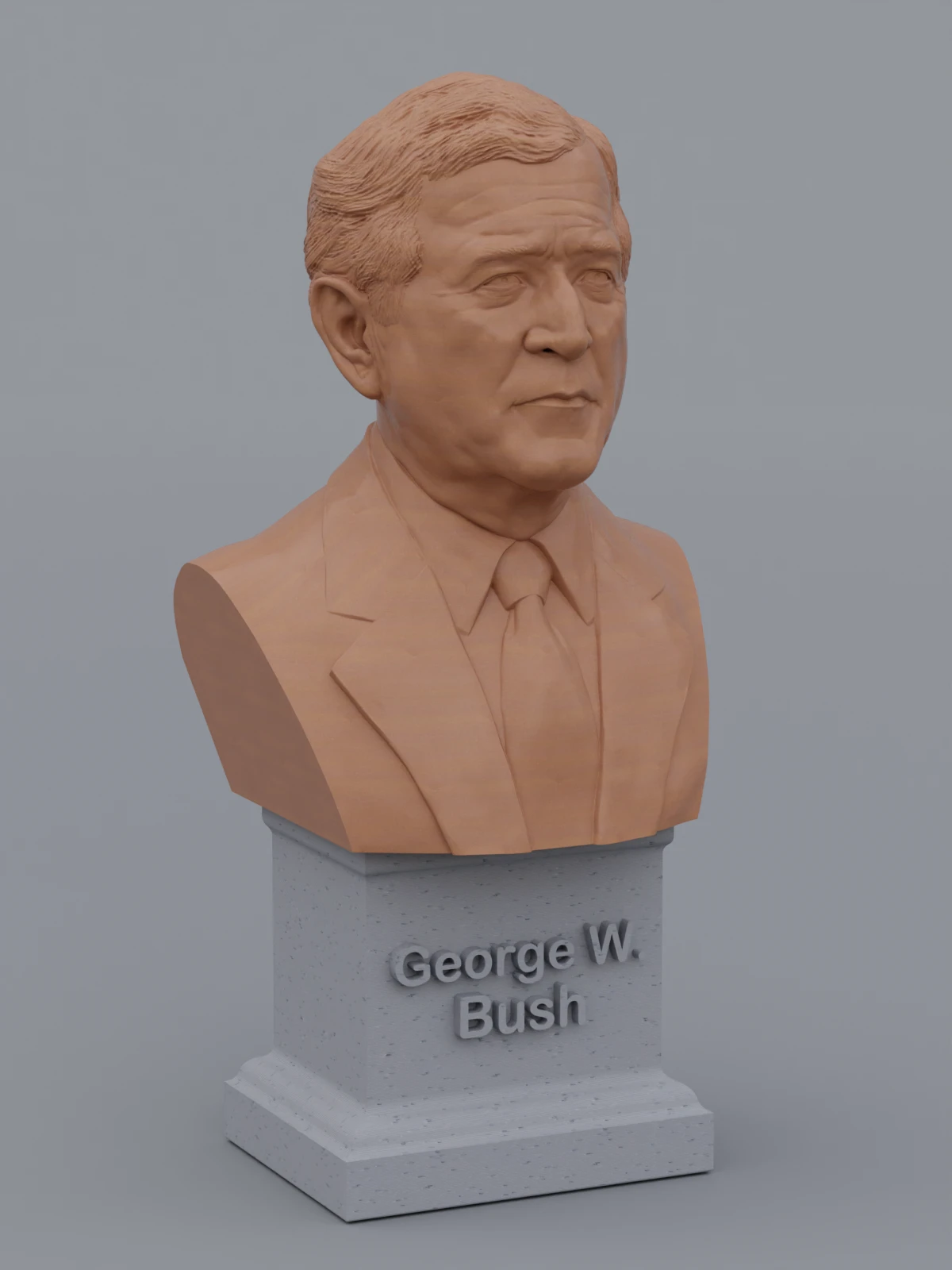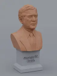 A traditional-style bust of George W Bush on a plinth pedestal. The plinth's front has a large name plate.
