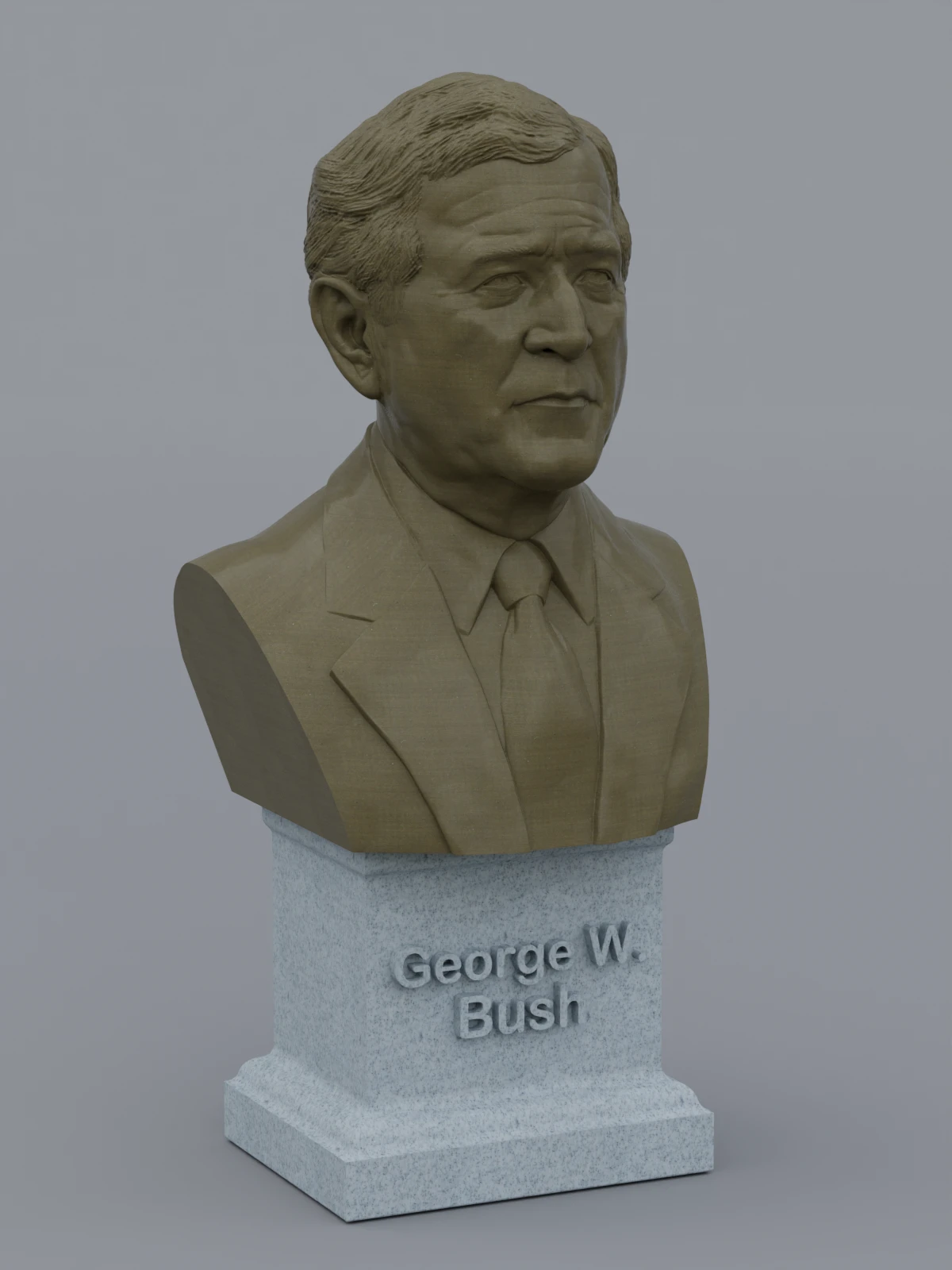 A traditional-style bust of George W Bush on a plinth pedestal. The plinth's front has a large name plate.