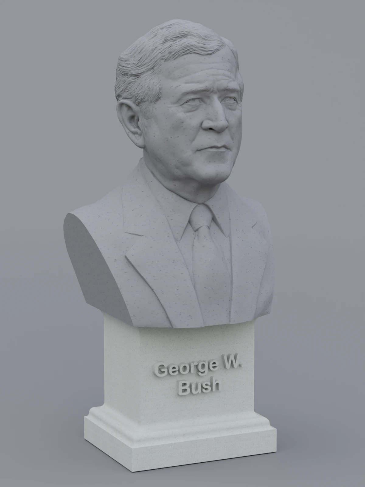 A traditional-style bust of George W Bush on a plinth pedestal. The plinth's front has a large name plate.
