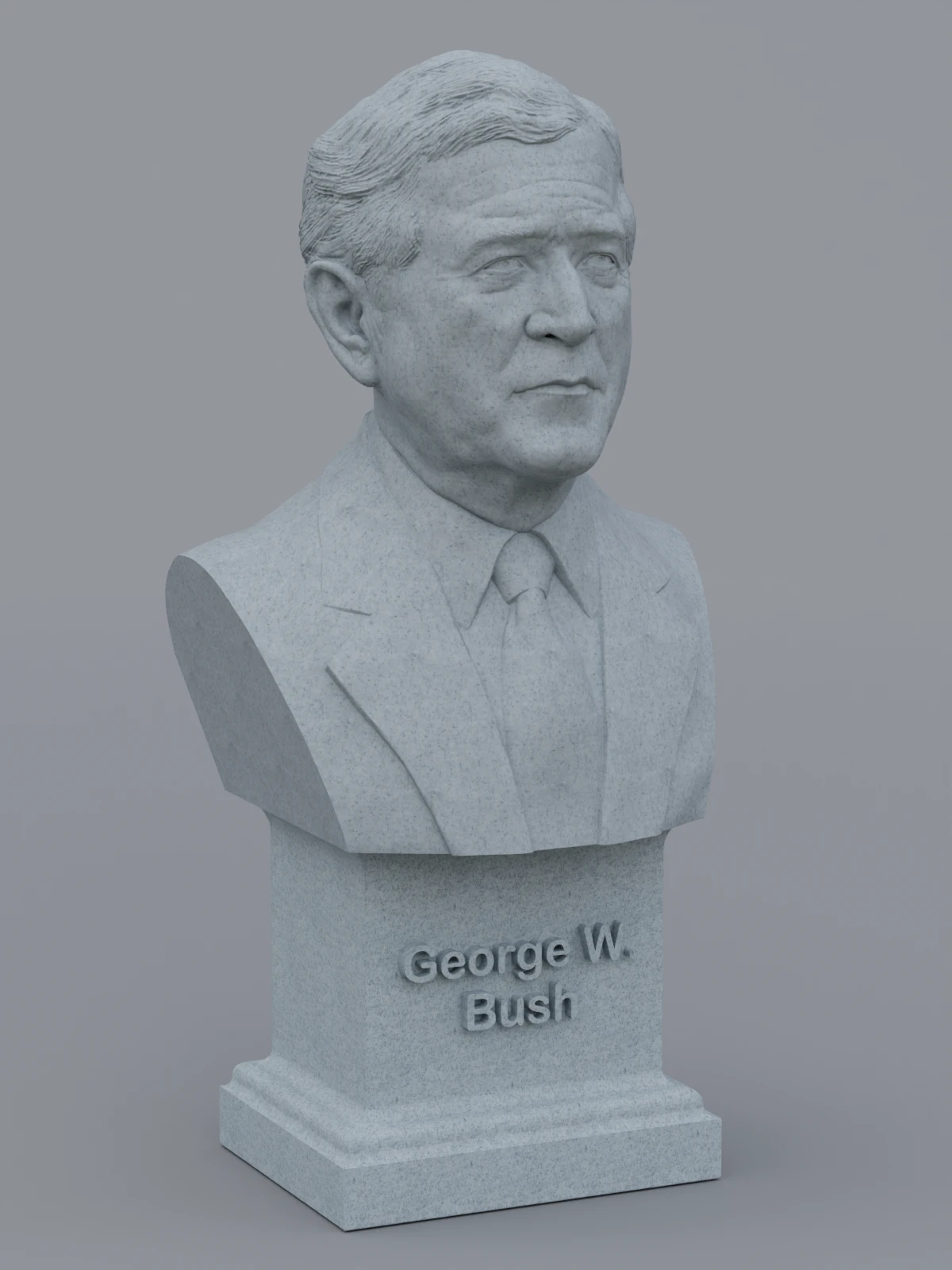 A traditional-style bust of George W Bush on a plinth pedestal. The plinth's front has a large name plate.