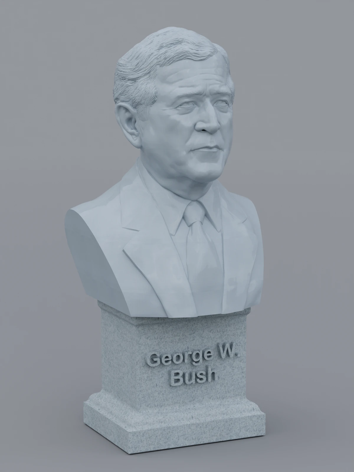 A traditional-style bust of George W Bush on a plinth pedestal. The plinth's front has a large name plate.