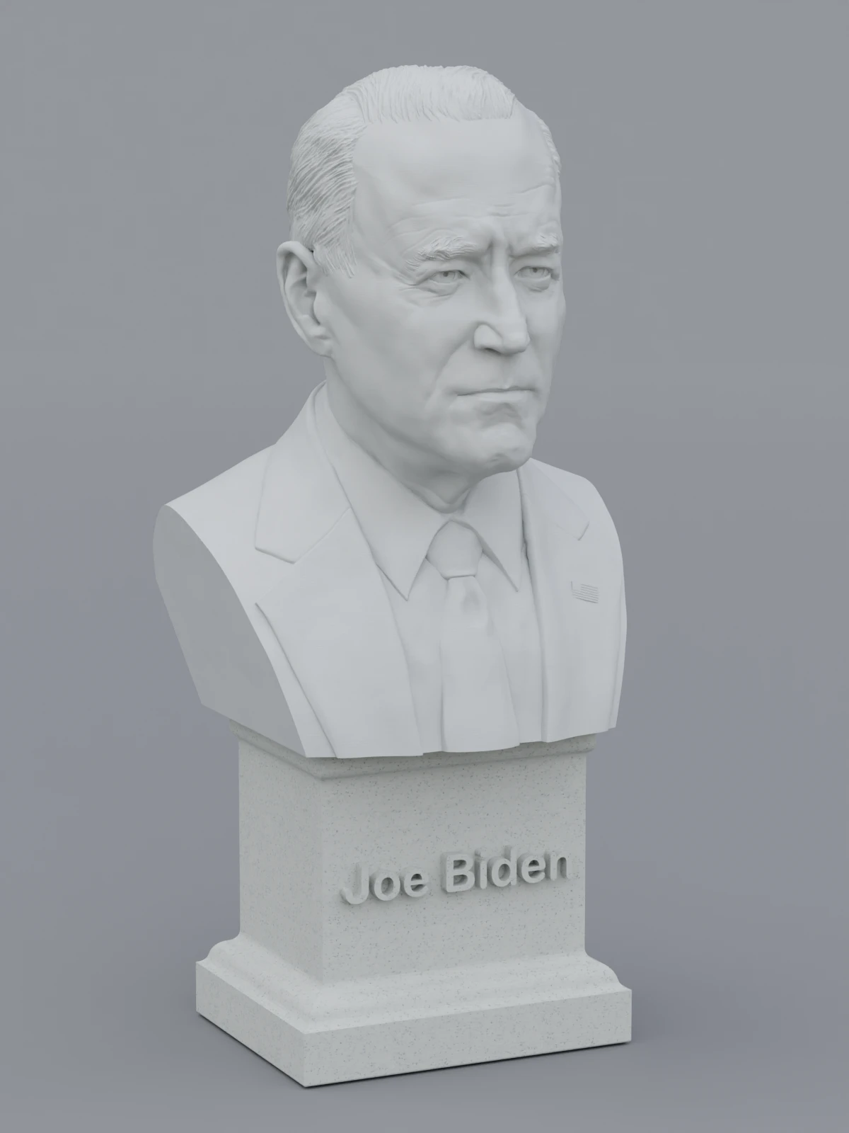 A traditional-style bust of Joe Biden on a plinth pedestal. The plinth's front has a large name plate.