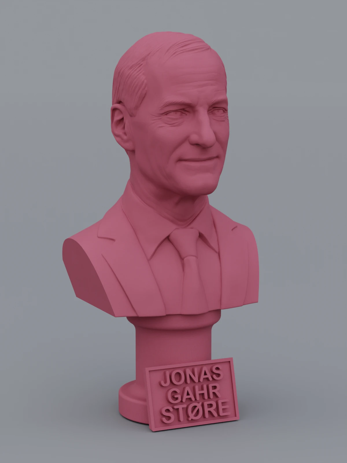 A traditional-style bust of Jonas Gahr Støre on a column pedestal. The bottom of the pedestal has a name plate.