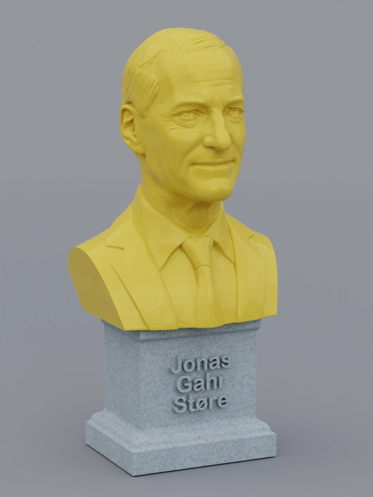 A traditional-style bust of Jonas Gahr Støre on a plinth pedestal. The plinth's front has a large name plate.