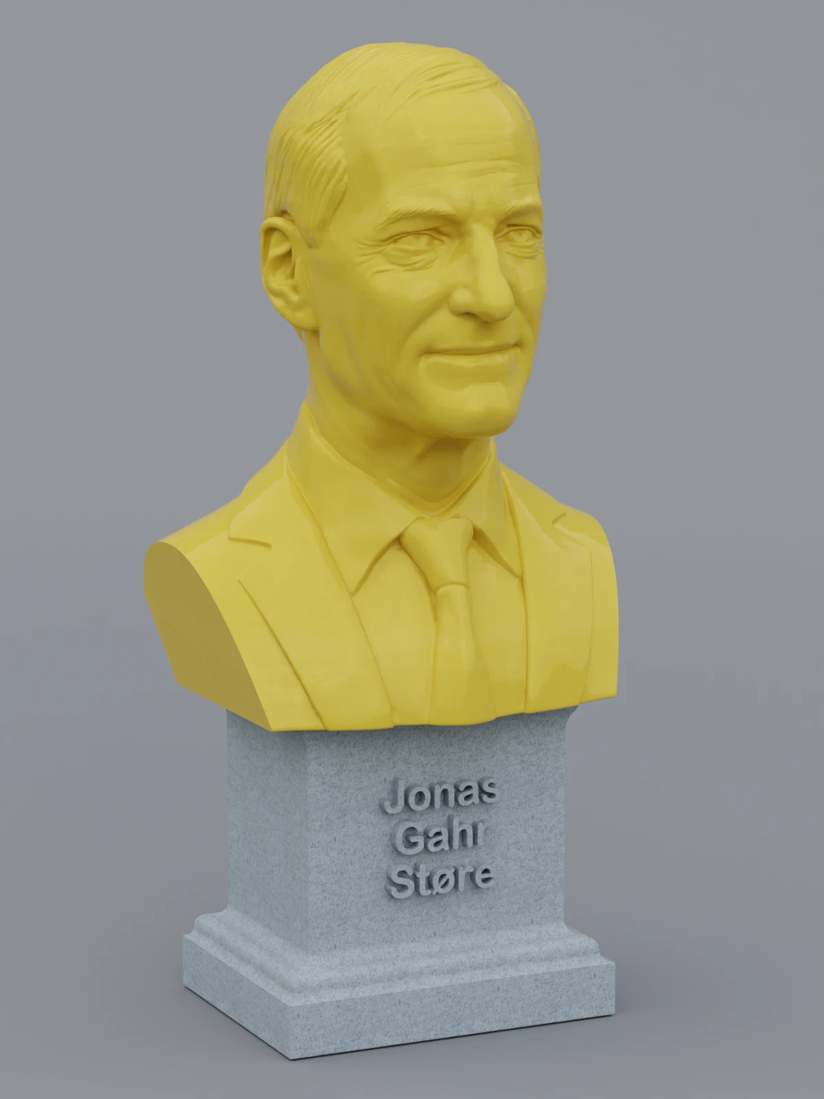 A traditional-style bust of Jonas Gahr Støre on a plinth pedestal. The plinth's front has a large name plate.