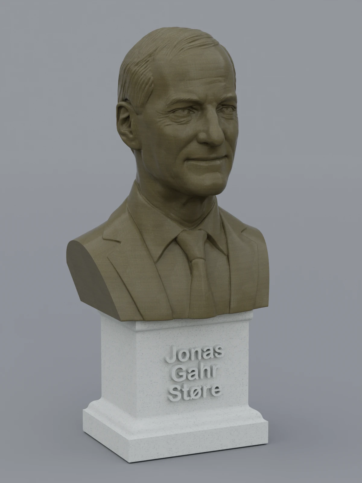 A traditional-style bust of Jonas Gahr Støre on a plinth pedestal. The plinth's front has a large name plate.