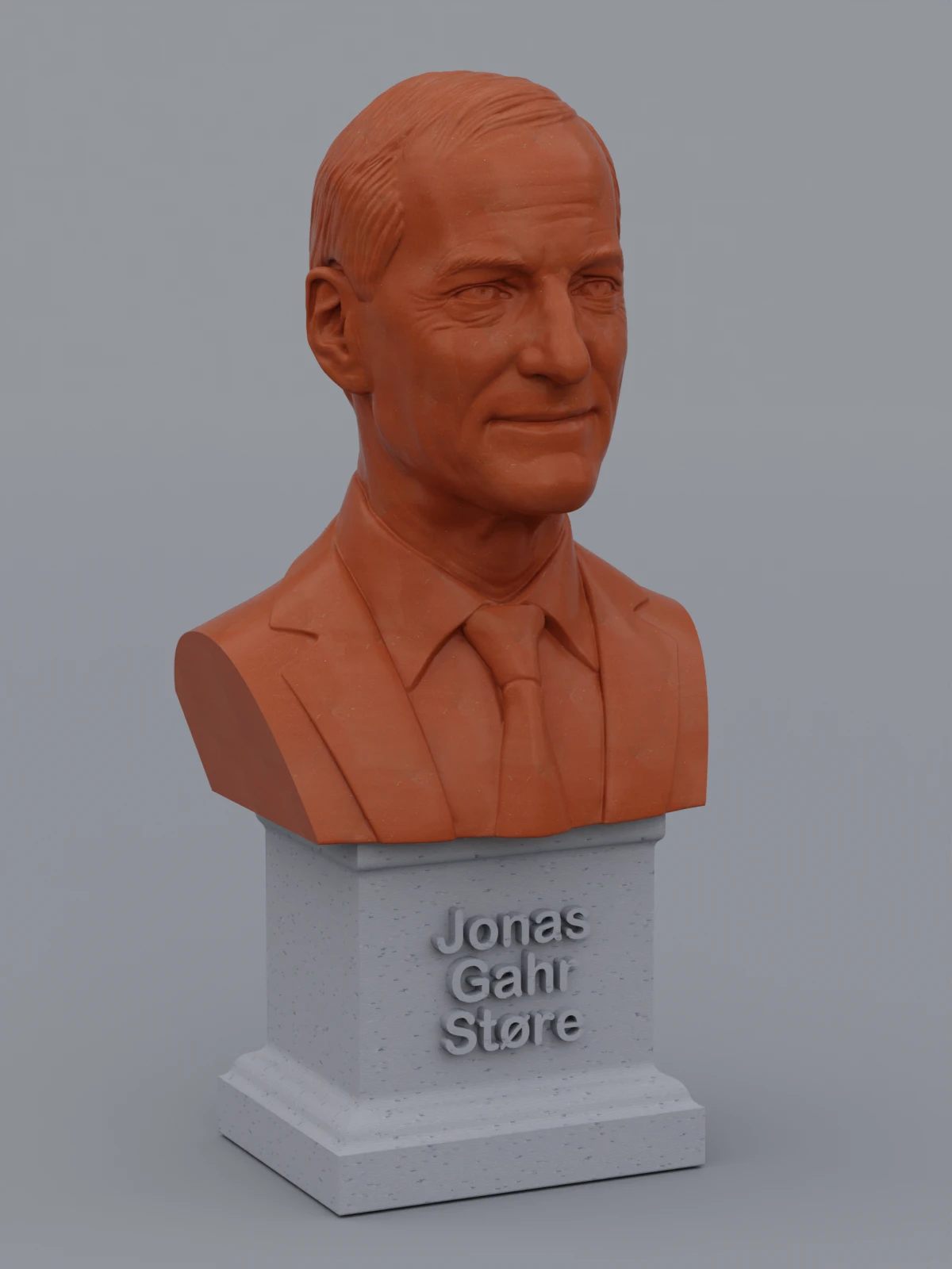 A traditional-style bust of Jonas Gahr Støre on a plinth pedestal. The plinth's front has a large name plate.