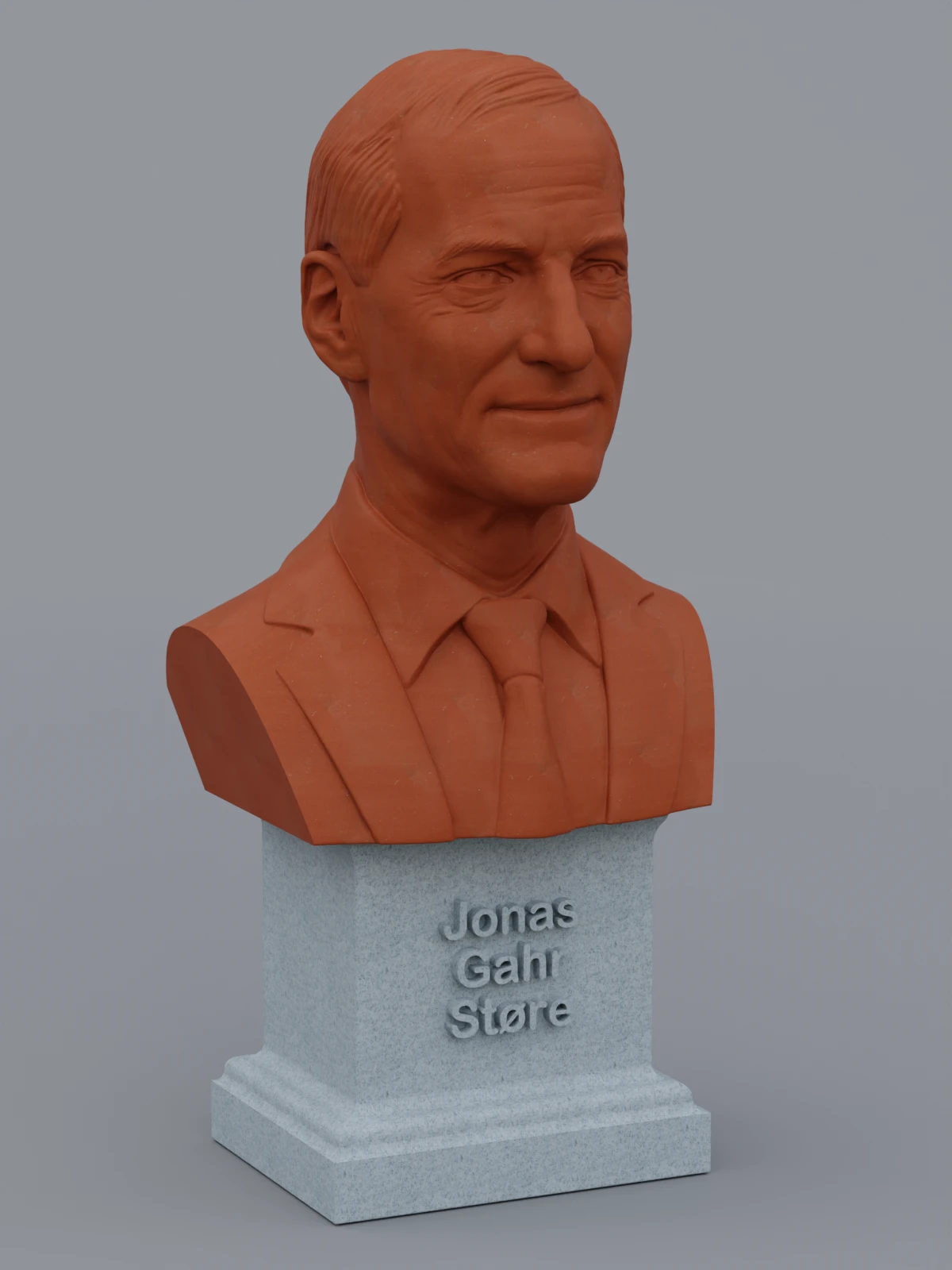 A traditional-style bust of Jonas Gahr Støre on a plinth pedestal. The plinth's front has a large name plate.
