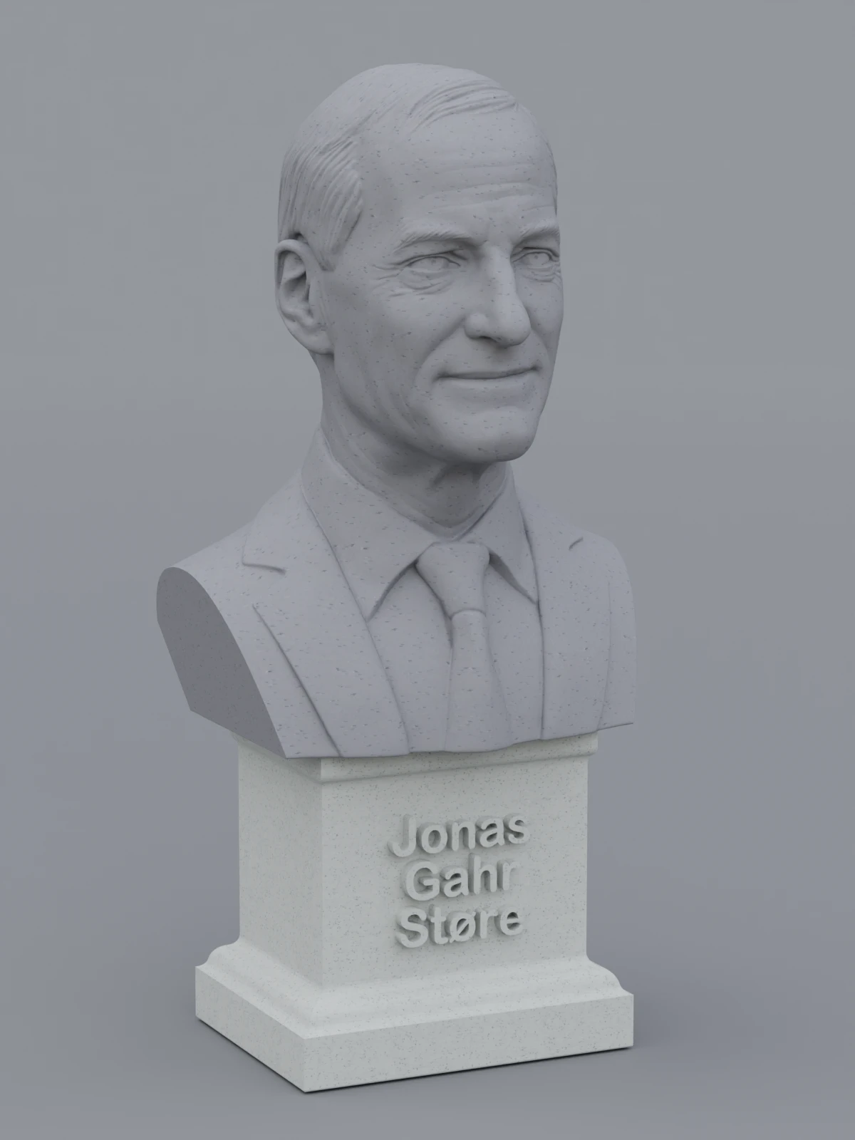 A traditional-style bust of Jonas Gahr Støre on a plinth pedestal. The plinth's front has a large name plate.