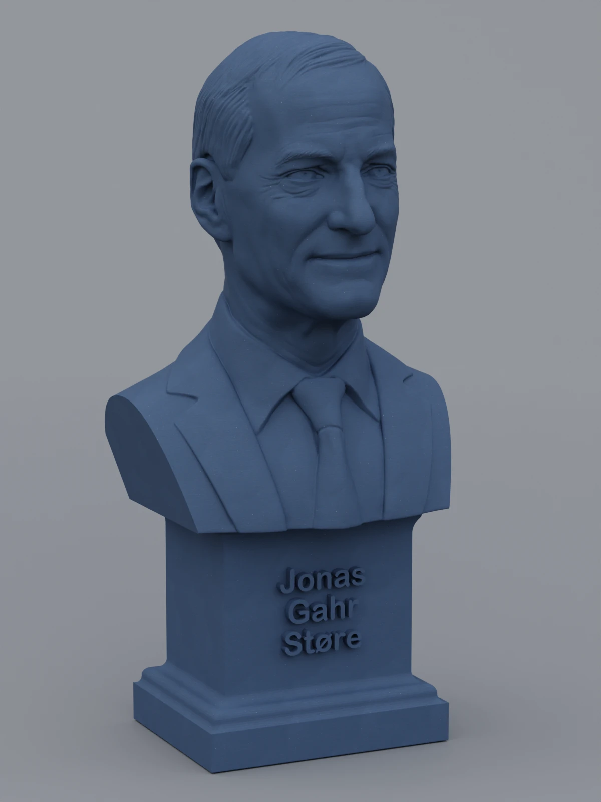 A traditional-style bust of Jonas Gahr Støre on a plinth pedestal. The plinth's front has a large name plate.