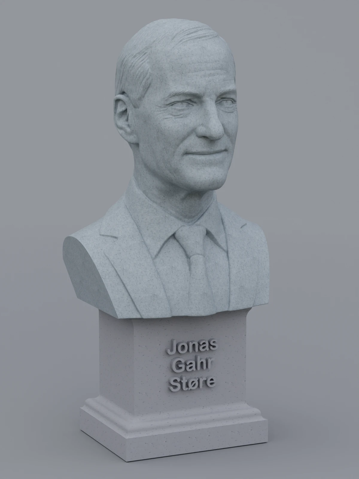A traditional-style bust of Jonas Gahr Støre on a plinth pedestal. The plinth's front has a large name plate.