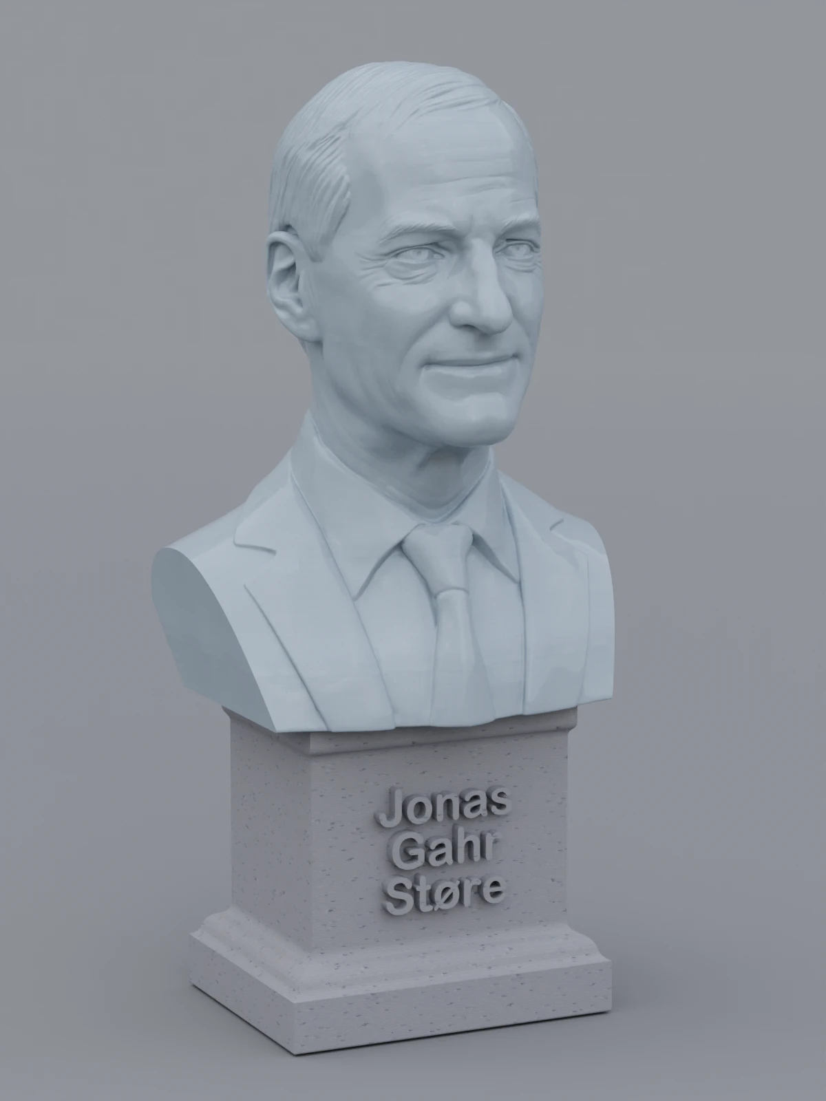 A traditional-style bust of Jonas Gahr Støre on a plinth pedestal. The plinth's front has a large name plate.