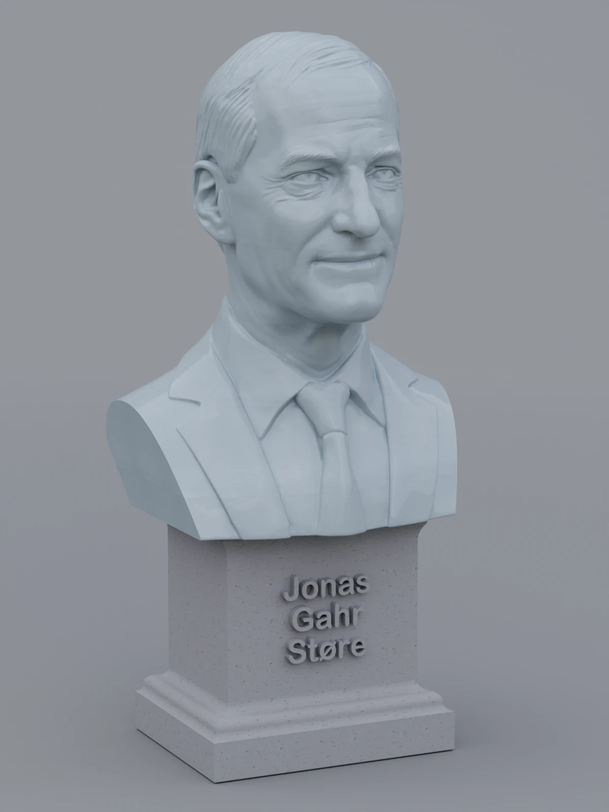 A traditional-style bust of Jonas Gahr Støre on a plinth pedestal. The plinth's front has a large name plate.