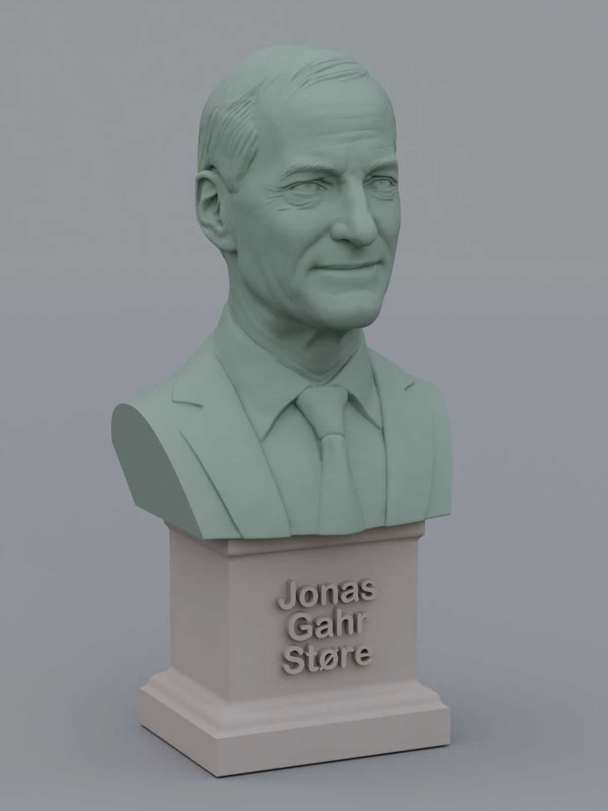 A traditional-style bust of Jonas Gahr Støre on a plinth pedestal. The plinth's front has a large name plate.
